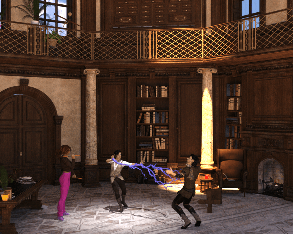 I stepped out, ready for battle with an escrima stick in each hand, and stopped short. Hobs and the hobgoblin were fighting in the library and some type of lightning moving between them. When Hobs was thrown into the book shelves beside the fireplace, I stepped in and delivered a one-two punch with the sticks and followed up by using both sticks together like a baseball bat. The force of my swing sent the hobgoblin crashing through the window.
